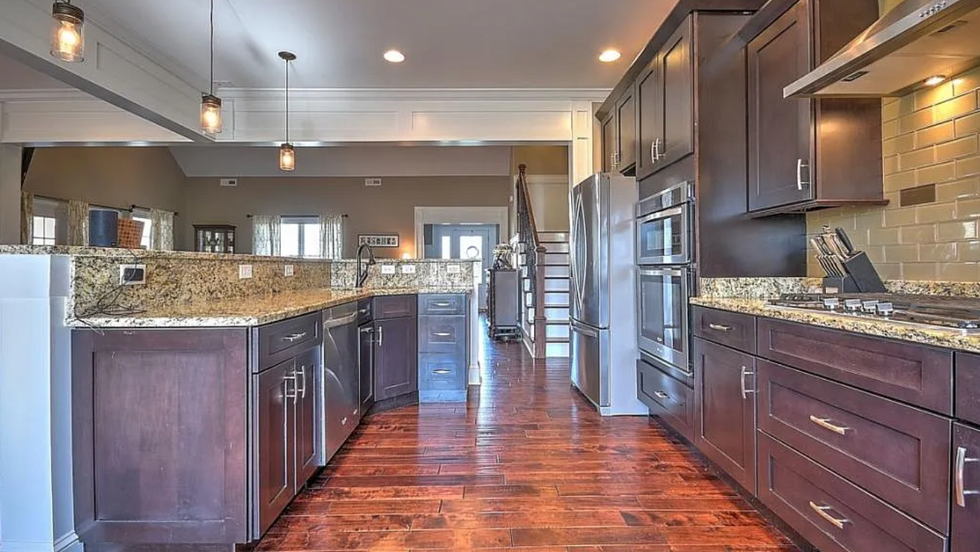 This beautifully designed kitchen showcases our signature blend of sophistication and smart design. Featuring rich espresso-stained shaker cabinetry, sleek stainless steel appliances, and a custom tile backsplash, the space is as functional as it is stylish. The granite countertops provide a stunning contrast to the dark cabinetry, while under-cabinet lighting and a professional-grade vent hood highlight the attention to detail. Warm hardwood floors add a welcoming touch, making this kitchen the heart of the home. Whether you're entertaining or enjoying a quiet night in, this space is designed to impress.